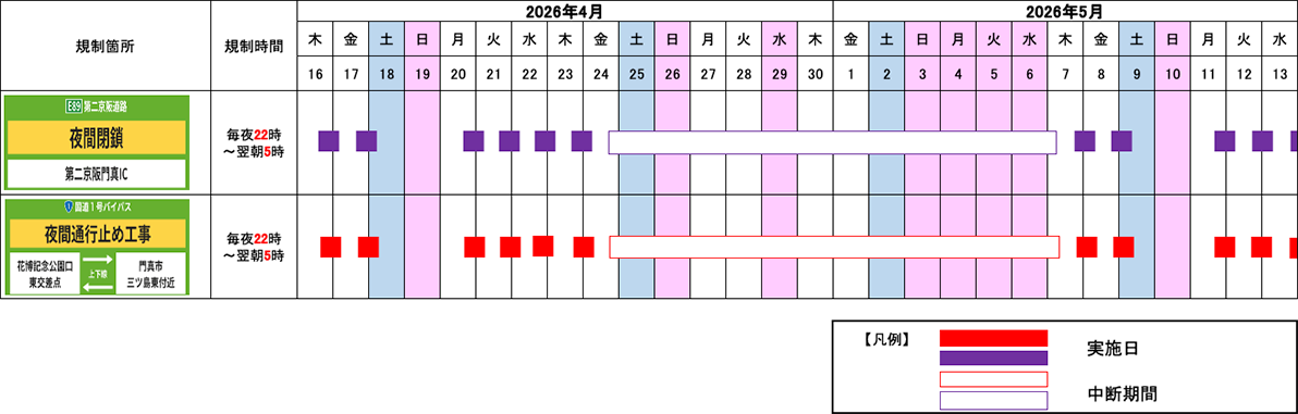 令和7年10月14日(火)から実施しております、E89第二京阪(E89第二京阪)第二京阪門真インターチェンジ(IC)夜間閉鎖および一般国道1号バイパス(大阪北道路)(上下線)における夜間通行止めは、ゴールデンウィークの交通混雑期間中は実施いたしません。